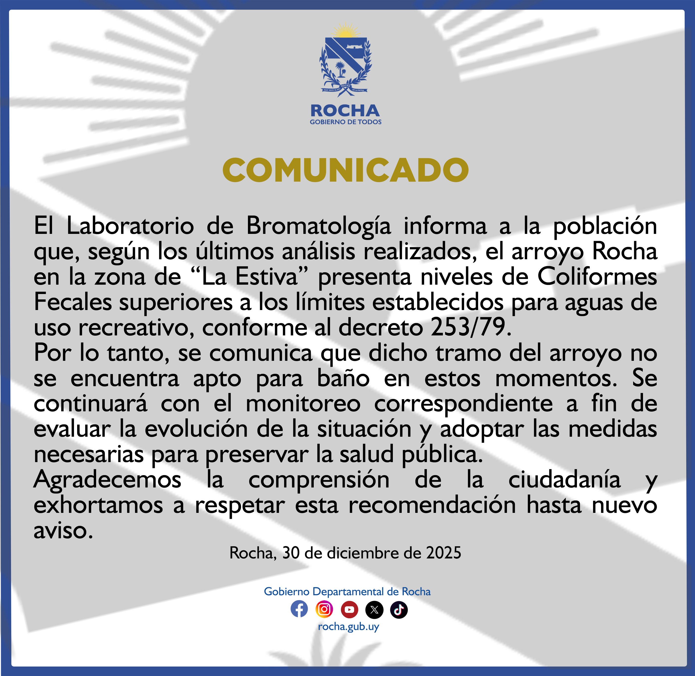 El Laboratorio de Bromatología informa a la población que, según los últimos análisis realizados, el arroyo Rocha en la zona de “La Estiva” presenta niveles de Coliformes Fecales superiores a los límites establecidos para aguas de uso recreativo, conforme al decreto 253/79.