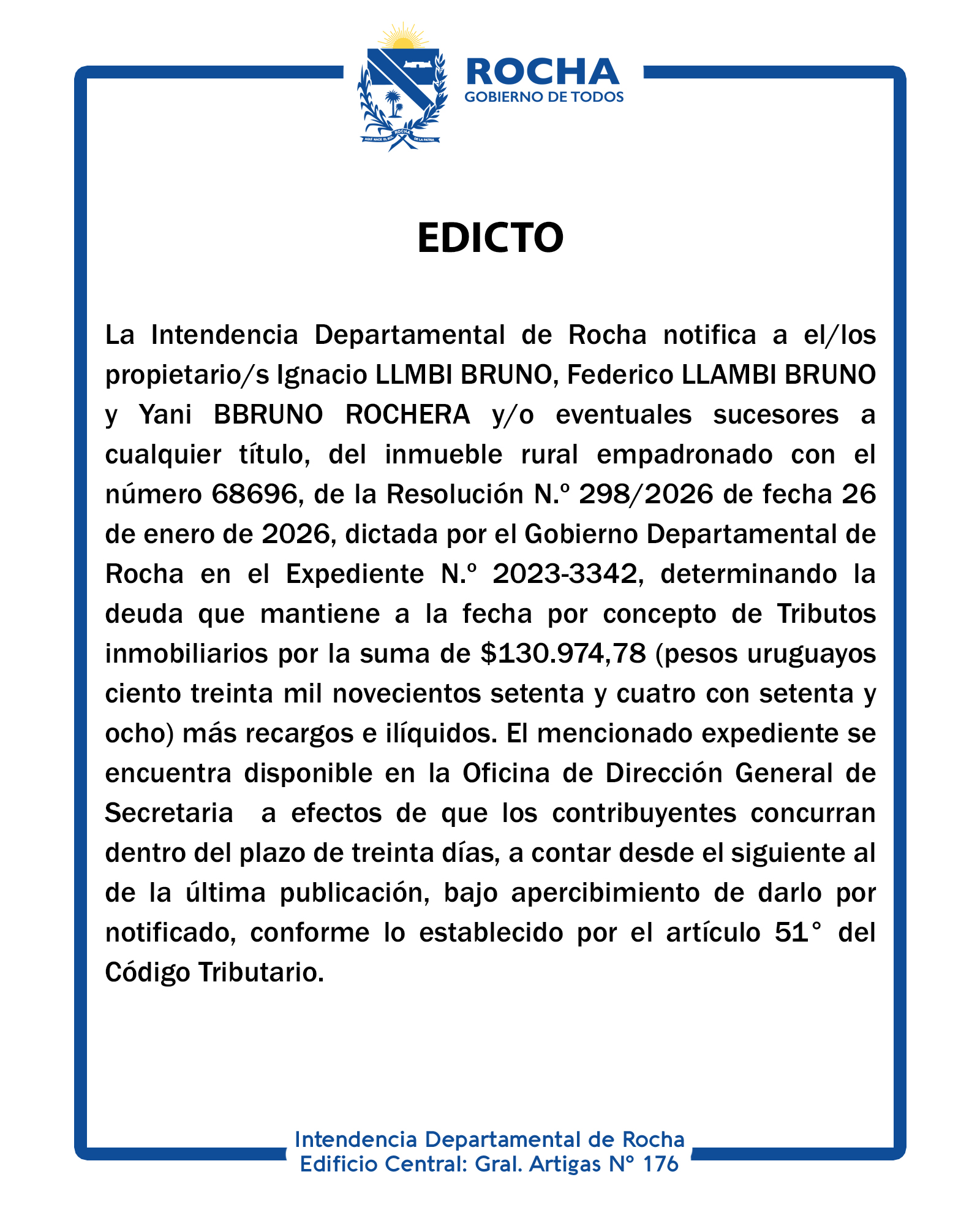 La Intendencia Departamental de Rocha notifica a el/los propietario/s Ignacio LLMBI BRUNO, Federico LLAMBI BRUNO y Yani BBRUNO ROCHERA y/o eventuales sucesores a cualquier título, del inmueble rural empadronado con el número 68696, de la Resolución N.º 298/2026 de fecha 26 de enero de 2026, dictada por el Gobierno Departamental de Rocha en el Expediente N.º 2023-3342, determinando la deuda que mantiene a la fecha por concepto de Tributos inmobiliarios por la suma de $130.974,78 (pesos uruguayos ciento treinta mil novecientos setenta y cuatro con setenta y ocho) más recargos e ilíquidos. El mencionado expediente se encuentra disponible en la Oficina de Dirección General de Secretaria a efectos de que los contribuyentes concurran dentro del plazo de treinta días, a contar desde el siguiente al de la última publicación, bajo apercibimiento de darlo por notificado, conforme lo establecido por el artículo 51° del Código Tributario.