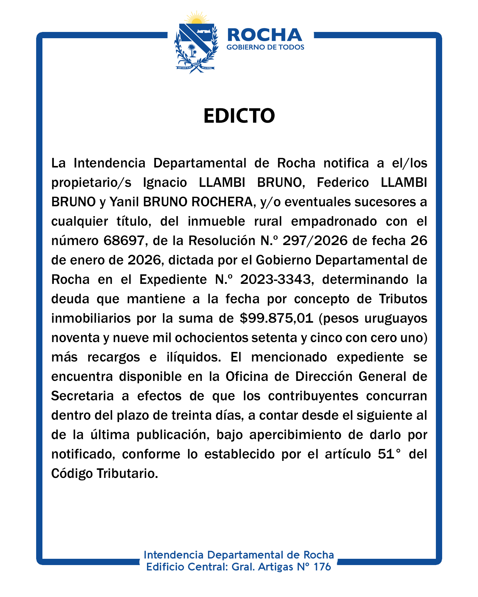 La Intendencia Departamental de Rocha notifica a el/los propietario/s Ignacio LLAMBI BRUNO, Federico LLAMBI BRUNO y Yanil BRUNO ROCHERA, y/o eventuales sucesores a cualquier título, del inmueble rural empadronado con el número 68697, de la Resolución N.º 297/2026 de fecha 26 de enero de 2026, dictada por el Gobierno Departamental de Rocha en el Expediente N.º 2023-3343, determinando la deuda que mantiene a la fecha por concepto de Tributos inmobiliarios por la suma de $99.875,01 (pesos uruguayos noventa y nueve mil ochocientos setenta y cinco con cero uno) más recargos e ilíquidos. El mencionado expediente se encuentra disponible en la Oficina de Dirección General de Secretaria a efectos de que los contribuyentes concurran dentro del plazo de treinta días, a contar desde el siguiente al de la última publicación, bajo apercibimiento de darlo por notificado, conforme lo establecido por el artículo 51° del Código Tributario.