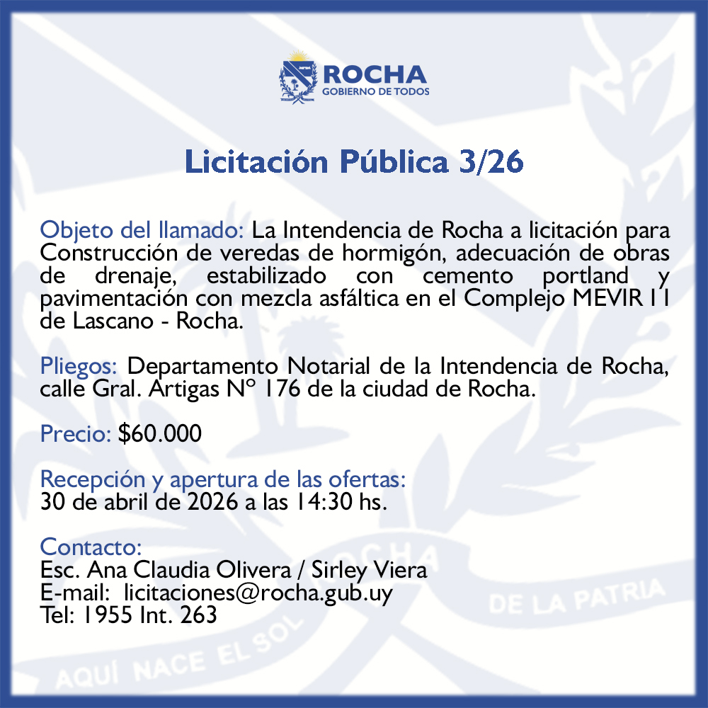 Contacto: Ana Claudia Olivera- E-mail: licitaciones@rocha.gub.uy