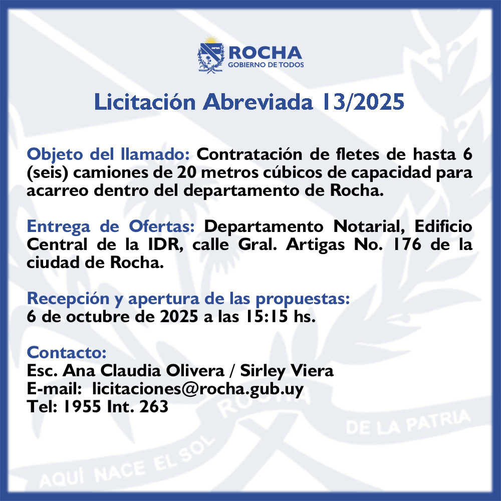 Objeto del llamado: Contratación de fletes de hasta 6 (seis) camiones de 20 metros cúbicos de capacidad para acarreo dentro del departamento de Rocha.
