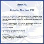 Licitación Pública 1/2026 Objeto del llamado: La Intendencia de Rocha a licitación para Servicios de conservación, mantenimiento y cuidado de distintas plazas, plazoletas y espacios públicos de la ciudad de Rocha. Pliegos: Intendencia Departamental de Rocha, Departamento Notarial, calle Gral. Artigas 176 de la Ciudad de y/o a través de la página web de la Comuna de Rocha www.rocha.gub.uy Precio: $ 10.000,00 Recepción y apertura de las propuestas : 24 de marzo de 2026 a las 14:30 hs. Contacto: Ana Claudia Olivera- E-mail: licitaciones@rocha.gub.uy (...)