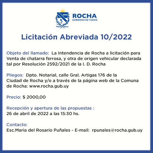 Pliegos: Intendencia Departamental de Rocha, Departamento Notarial, calle Gral. Artigas 176 de la Ciudad de y/o a través de la página web de la Comuna de Rocha www.rocha.gub.uy