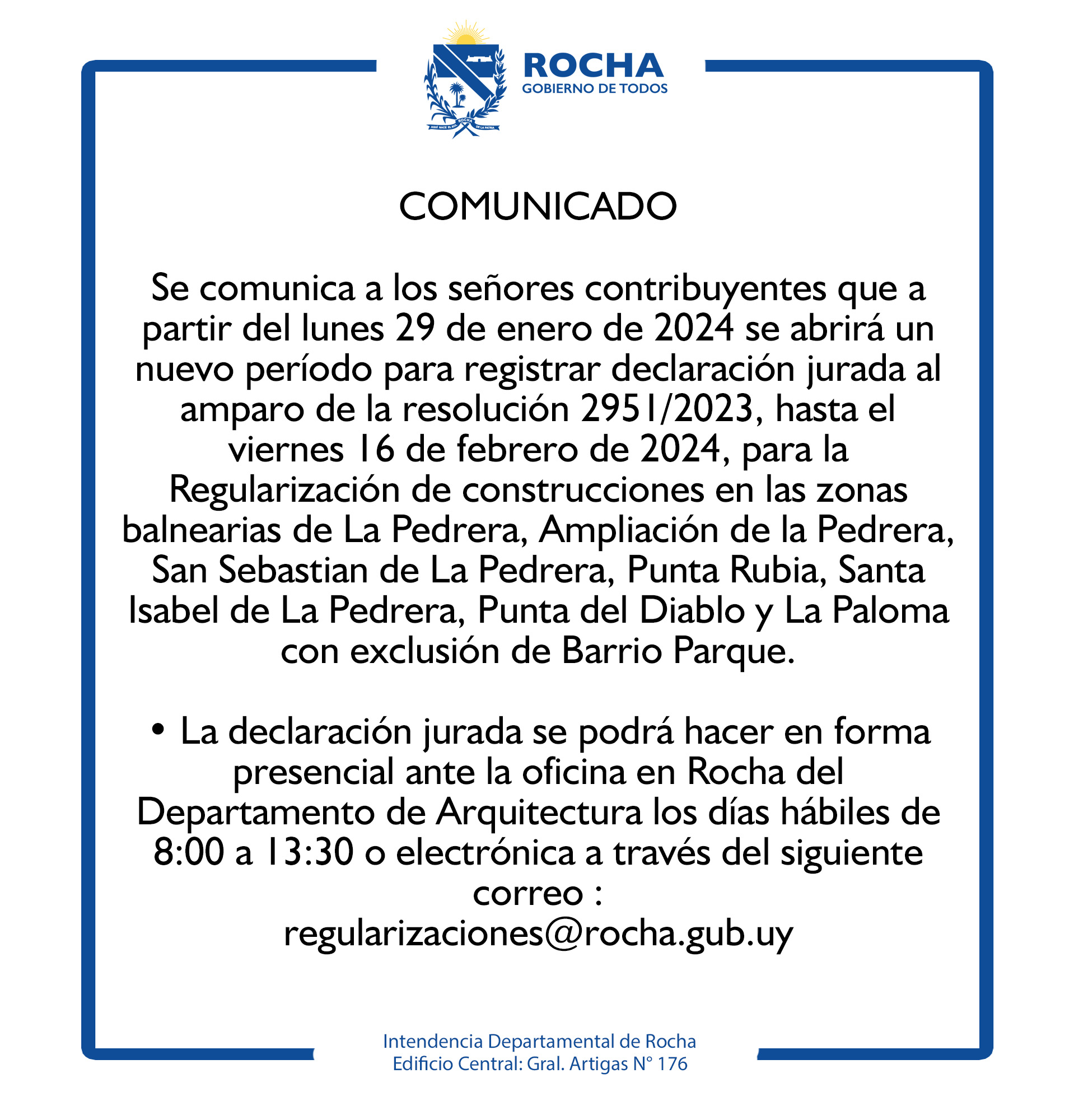 Se comunica a los señores contribuyentes que a partir del lunes 29 de enero de 2024 se abrirá un nuevo período para registrar declaración jurada al amparo de la resolución 2951/2023, hasta el viernes 16 de febrero de 2024, para la Regularización de construcciones en las zonas balnearias de La Pedrera, Ampliación de la Pedrera, San Sebastian de La Pedrera, Punta Rubia, Santa Isabel de La Pedrera, Punta del Diablo y La Paloma con exclusión de Barrio Parque.